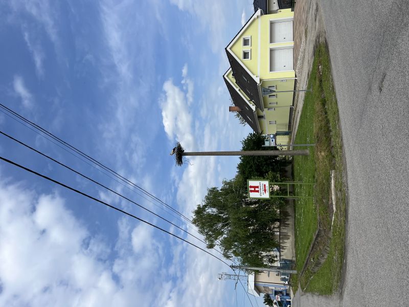 Samostatný stĺp s podložkou a hniezdnym materiálom v blízkosti kostola pri dome č. 320 - oproti komína s obsadeným hniezdom. Podložka je neobsadená.