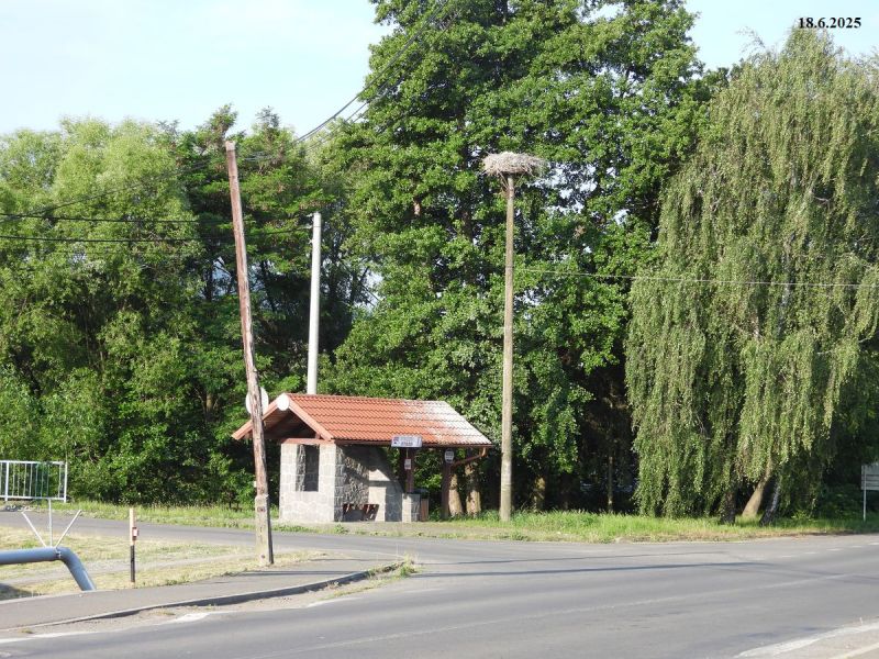 25.5.2019 Na hniezde samica bez krúžku a min 2 mláďatá. Na stĺpe oproti hniezdu cez cestu stáli dva bociany. Jeden mal krúžok V 2821.