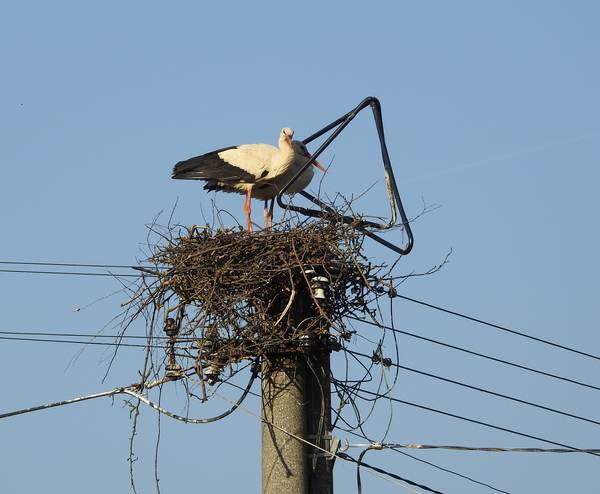 Hniezdo bolo zhodené, nainštalovaná zábrana, Bociany novú podložku neprijali a robia si hniezdo na pôvodnom stĺpe aj napriek zábrane.
