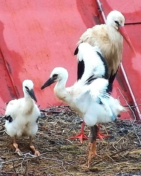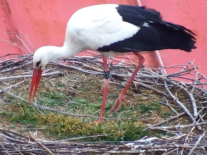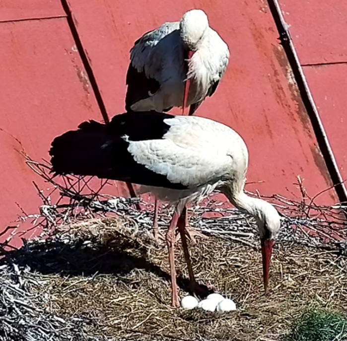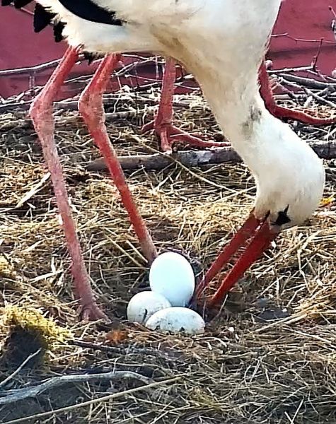 Znáška 4 vajec. Dlhé minúty odolával "domáci" pár útokom tretieho bociana, v dôsledku čoho jedno vajce zostalo mimo "ideálneho hniezdiska". Aj ostatná znáška bola vystavená chladu.