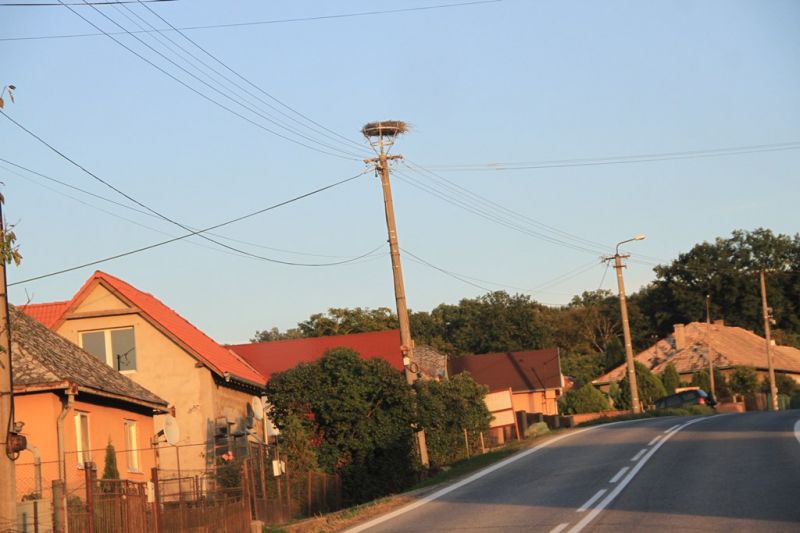 16.29 jeden bocian na hniezde a vidieť jedno mláďa, druhý dospelý jedinec sedel na susednej lampe verejného osvetlenia