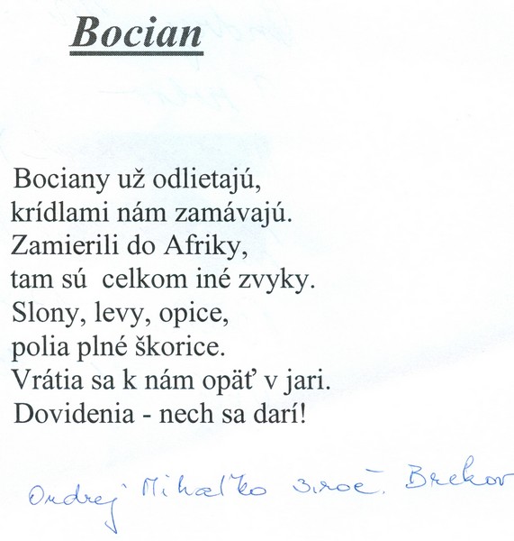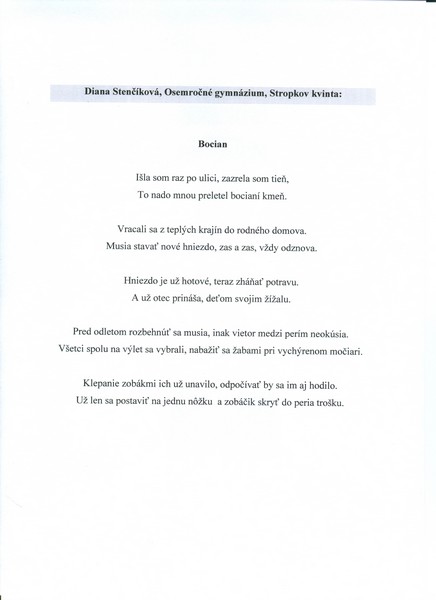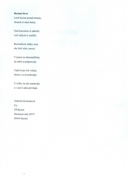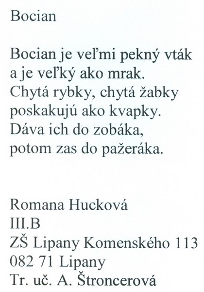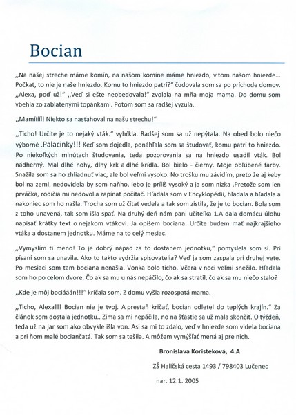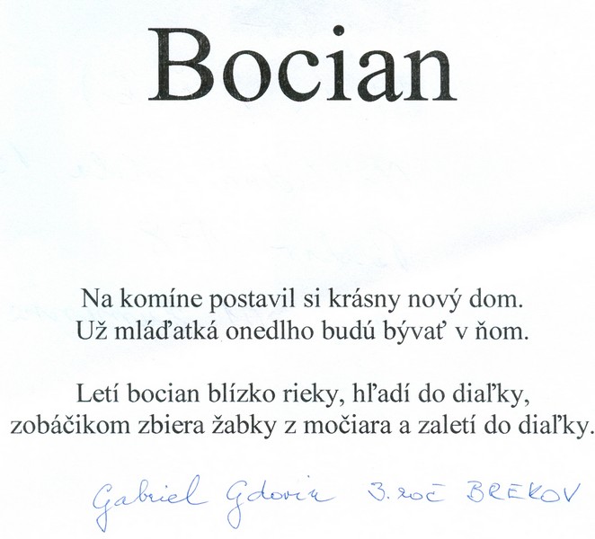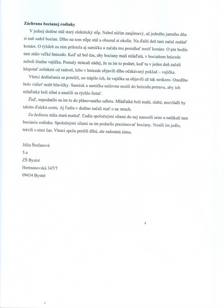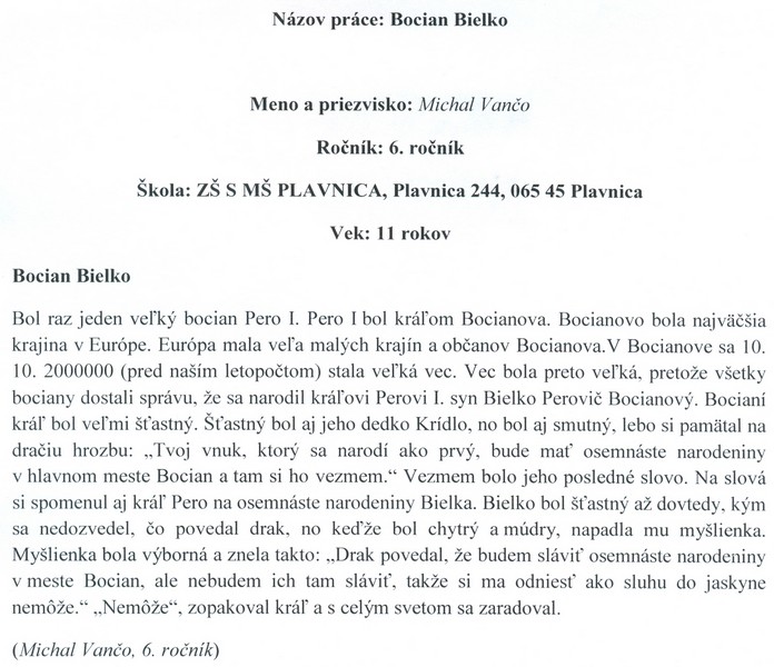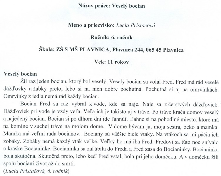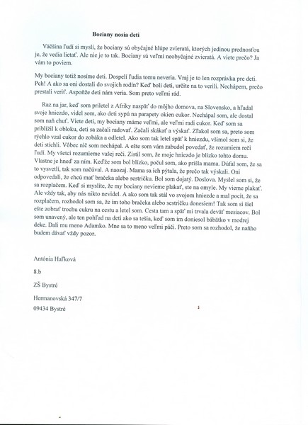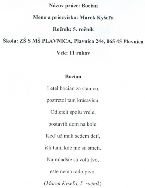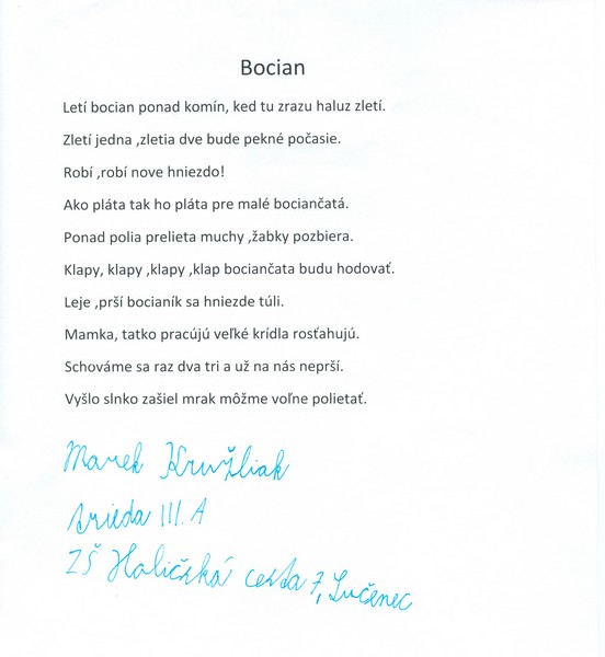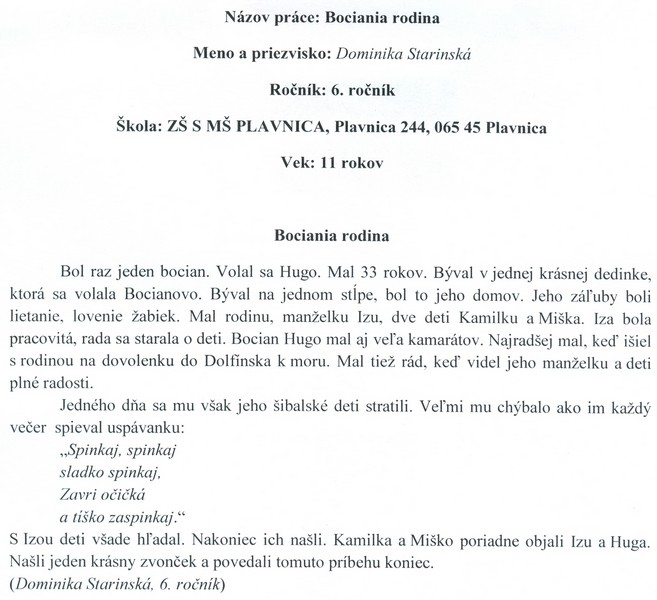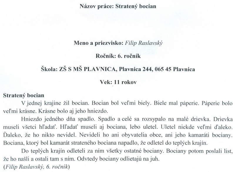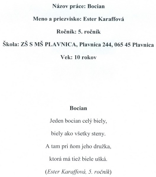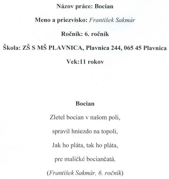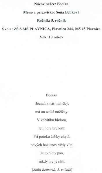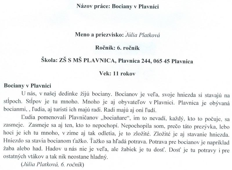 Zaslané práce svojim prevedením, úrovňou spracovania a zaujatím s akým ich jednotliví autori spracovali nás, úprimne povedané, zaskočil. Počet prác nás natoľko potešil, že sme ich prihlásili na Slovenský rekord v počte vytvorených prác s tematikou bociana bieleho v rámci jedného podujatia. Zoznam víťazných prác je zverejnený na webovej stránke www.vtaky.sk. Oceniť väčšou či menšou cenou sme sa ale rozhodli každého účastníka. Ocenenia a pozornosti od organizátorov súťaže zasielame autorom prác na adresu školy v hromadnej zásielke. Ospravedlňujeme sa, ak meno autorov sme nesprávne prečítali, písmo