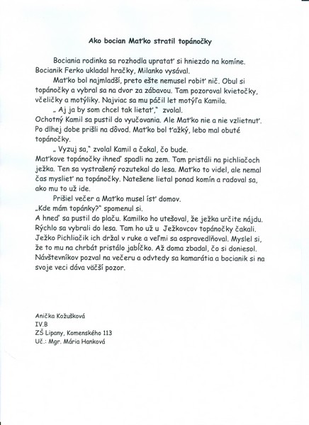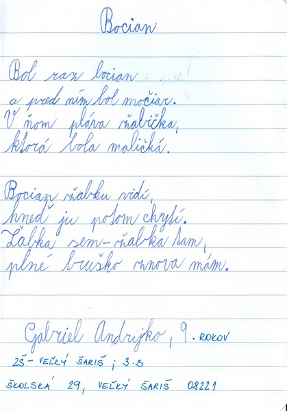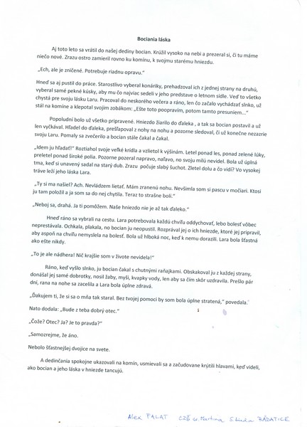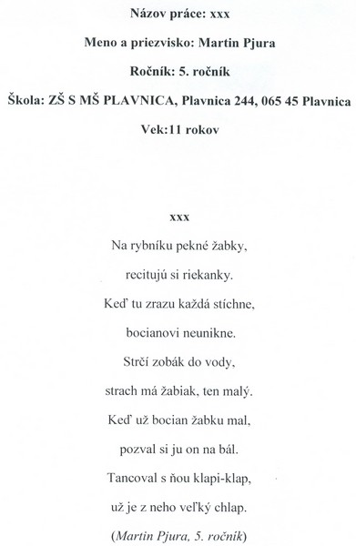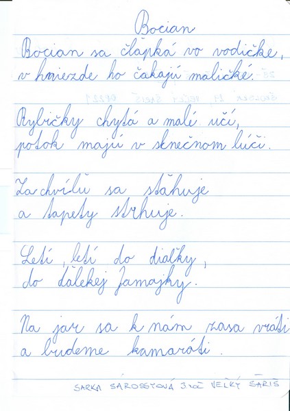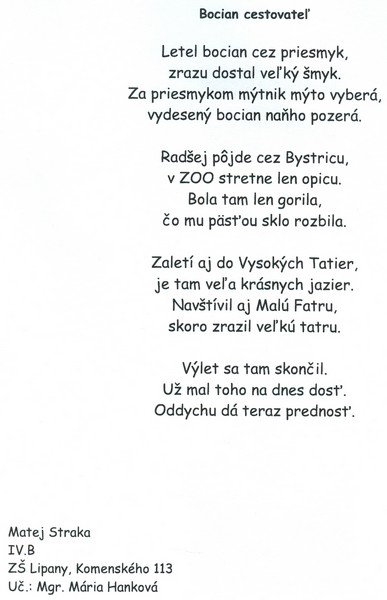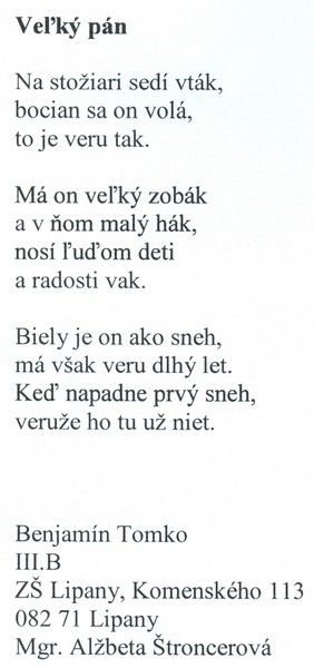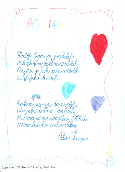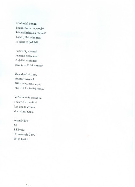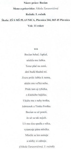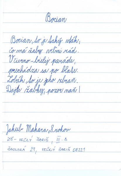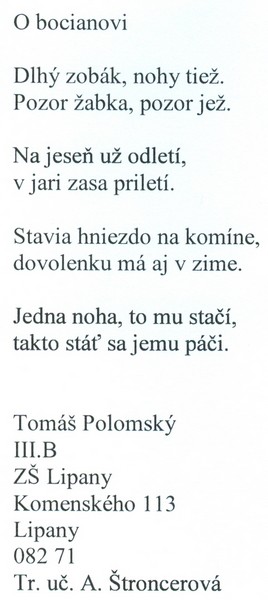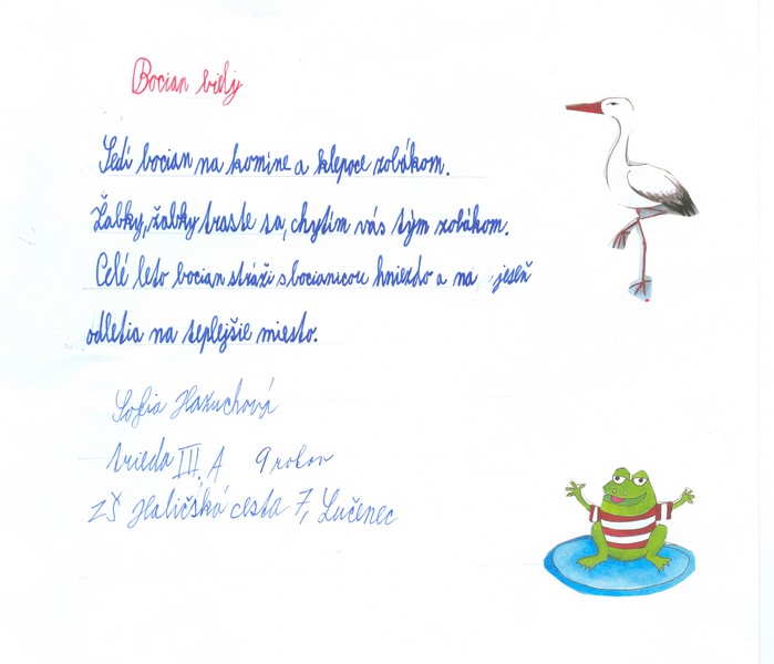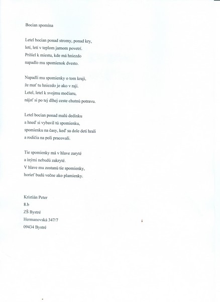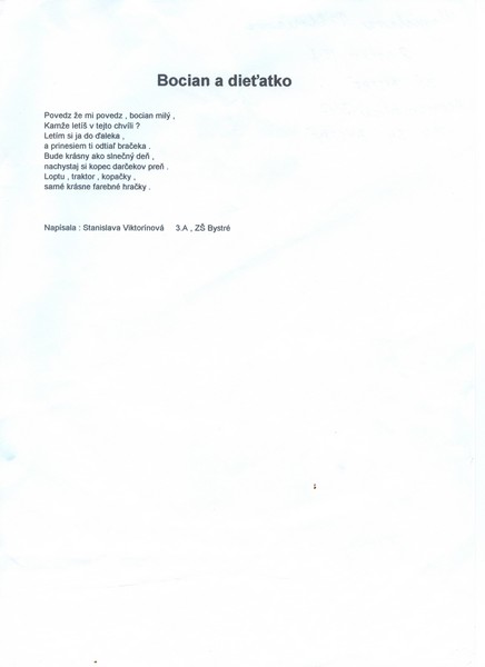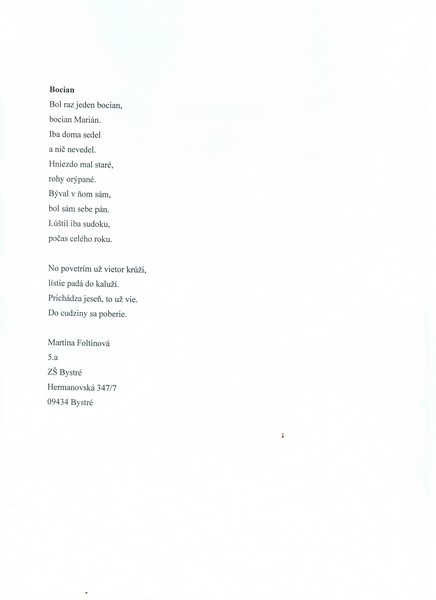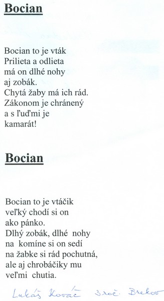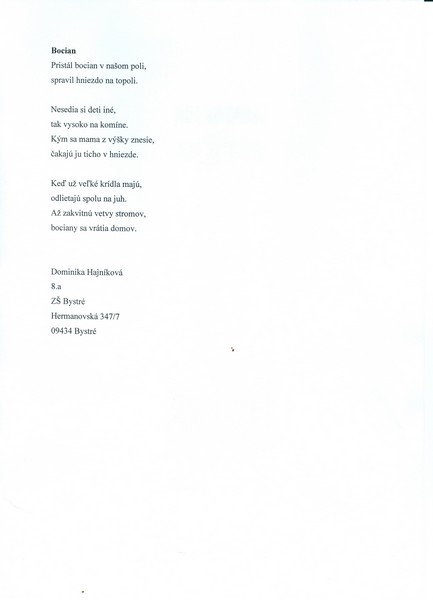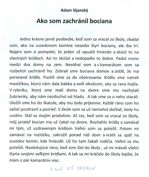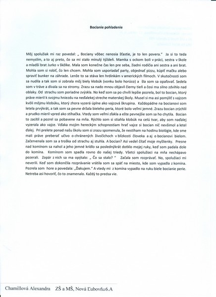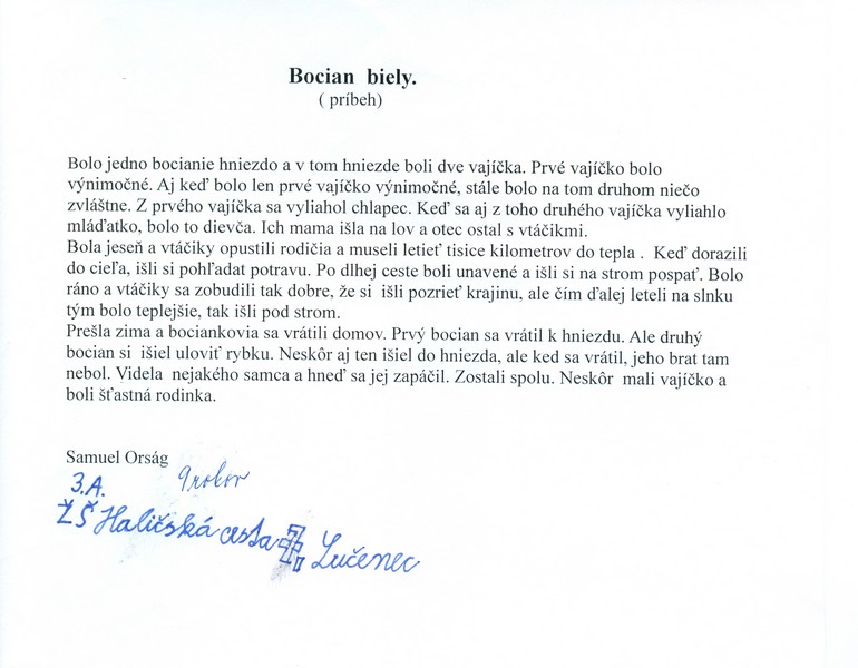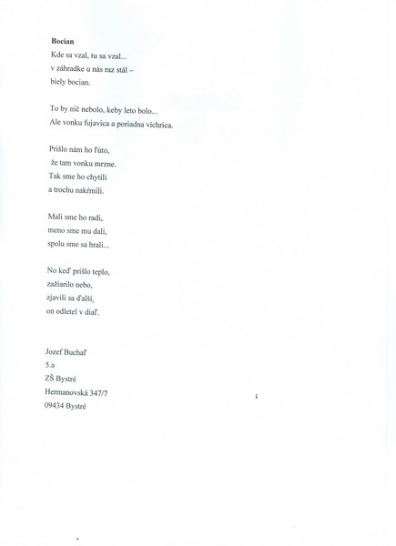 Zaslané práce svojim prevedením, úrovňou spracovania a zaujatím s akým ich jednotliví autori spracovali nás, úprimne povedané, zaskočil. Počet prác nás natoľko potešil, že sme ich prihlásili na Slovenský rekord v počte vytvorených prác s tematikou bociana bieleho v rámci jedného podujatia. Zoznam víťazných prác je zverejnený na webovej stránke www.vtaky.sk. Oceniť väčšou či menšou cenou sme sa ale rozhodli každého účastníka. Ocenenia a pozornosti od organizátorov súťaže zasielame autorom prác na adresu školy v hromadnej zásielke. Ospravedlňujeme sa, ak meno autorov sme nesprávne prečítali, písmo